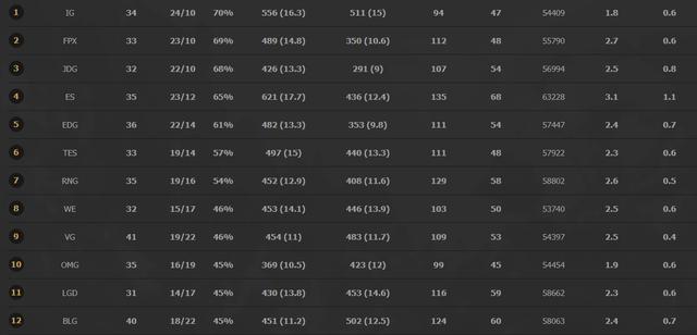 我们先来看看IG的一些较差的场均数据,场均控龙数第16(一共17支队伍,队伍太多无法全部显示全部数据),场均补兵数第15(比ig还少的是V5和WE),场均死亡人数第3名,插眼和排眼数分别是16、15。而场均击杀是第二(第一是ES),推塔是第三,看着这数据可以说是太差了。不过人家IG就是积分和胜率第一,这是不是很不科学。有网友就开玩笑的说,“IG从不买眼,因为IG把买眼的钱全部都拿去买装备了。不然IG怎么在团战中打出那么高的伤害,哪来的经济”。不过这也是一句玩笑话,主要还是IG人人都是操作怪,线上优势就是这样打出来的,不过把把大乱斗的数据的确不好看!
