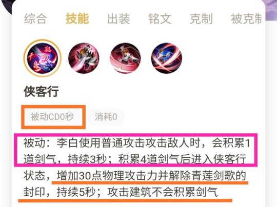 从李白的被动技能中找出关键效果:1.剑气、2.提升物理攻击、3.解锁青莲剑歌。