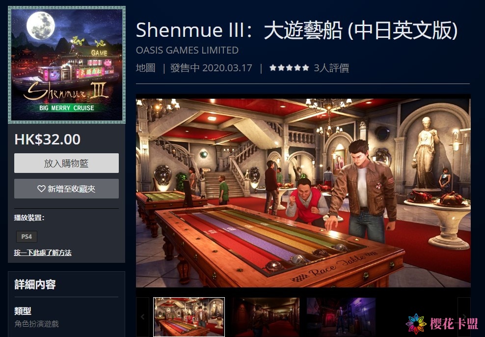 今天(3月17日)《莎木 3》的付费故事任务包 DLC“大游艺船”现已正式配信,玩家可以在 PS Store 以及 Epic 平台(购买页面暂未上线)上购买本支 DLC,售价32港币(约合28.8元)此前已经购买了完整 DLC 合集的玩家可以直接获取。在“大游艺船”DLC 中玩家可以享受娱乐消遣,也可以游玩各种挑战任务,获取芭月凉的新服装。