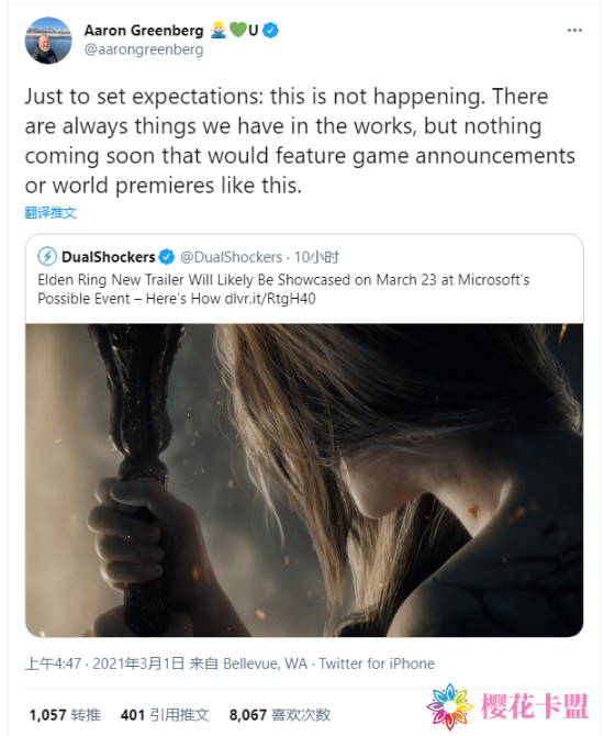 而爆料《Elden Ring》在三月末会有新消息的Jeff Grubb在该条推特下回复:“我绝对没说过它(《Elden Ring》)会出现在任何Xbox活动上。”