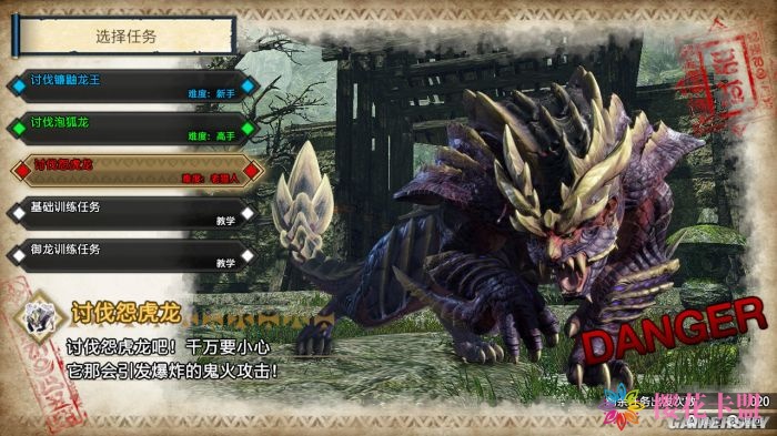 尽管怨虎龙的攻击动作并不算鬼畜,但Demo中提供的防具很难抗住怨虎龙连续两次攻击,而在没有通过环境生物把血量上限加满时,其某些动作甚至能让猎人们“一击猫车”。再加之任务时间限制在了15分钟以内,你很难有时间跑遍全图收集环境生物把血量、防御升至上限。