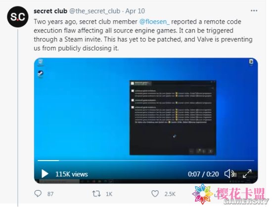 该推特说两年前团队成员Florian发现了一个存在于《反恐精英:全球攻势》内部的一个远程代码漏洞,该漏洞可通过发送《CS:GO》的Steam邀请触发,受害者的电脑可能会被黑客远程操控进而盗取用户信息。尽管Valve的多款游戏都有存在该漏洞的可能,但是俱乐部宣称“目前只发现《CS:GO》存在此漏洞”。