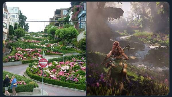 Reddit网友CptnCASx近日将《地平线:西部禁域》已公布的部分图片和旧金山现实地标进行了对比,像九曲花街(Lombard Street)和轮渡大厦(Ferry Building)等标志性地点都传达着衰败的旧金山在游戏首发时所拥有的外观和基调。从照片上看,Guerrilla Games对城市的描绘很用心。