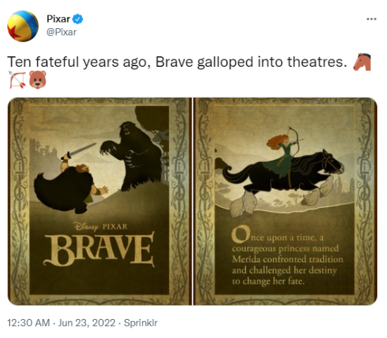 今日(6月23日)是《勇敢传说》上映十周年,皮克斯动画工作室官方推特分享了几张纪念版艺术海报,一起来回顾梅莉达公主的故事!