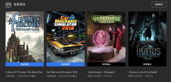 Epic商城的“喜加一”活动开启,本周送出棋盘战略游戏《权力的游戏:桌面游戏》和模拟游戏《汽车修理工模拟2018》两款,下周送出《Geneforge 1-Mutagen》和《伊拉图斯:死之主》。