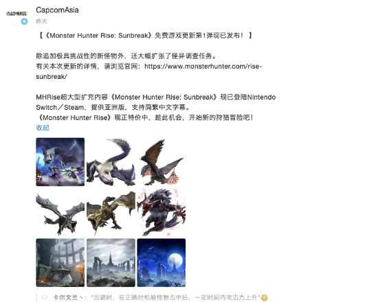 《怪物猎人崛起:曙光》已于昨日更新,除了新怪物和新的“怪异调查”玩法的加入,本次更新还新增了一些实用技能,但似乎本地化并未让玩家们满意。